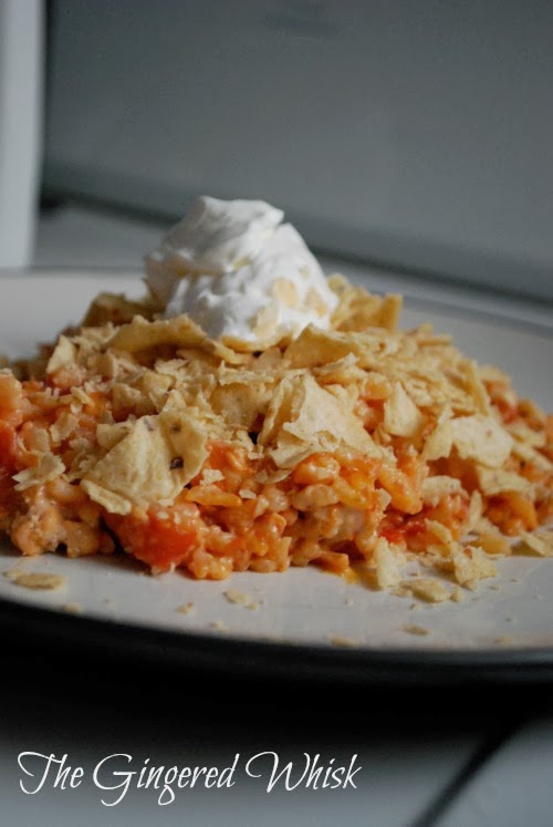 - Serve with sour cream and tortilla chips (you can either crunch the chips up on top or you can use the chips to scoop the casserole and eat it that way).